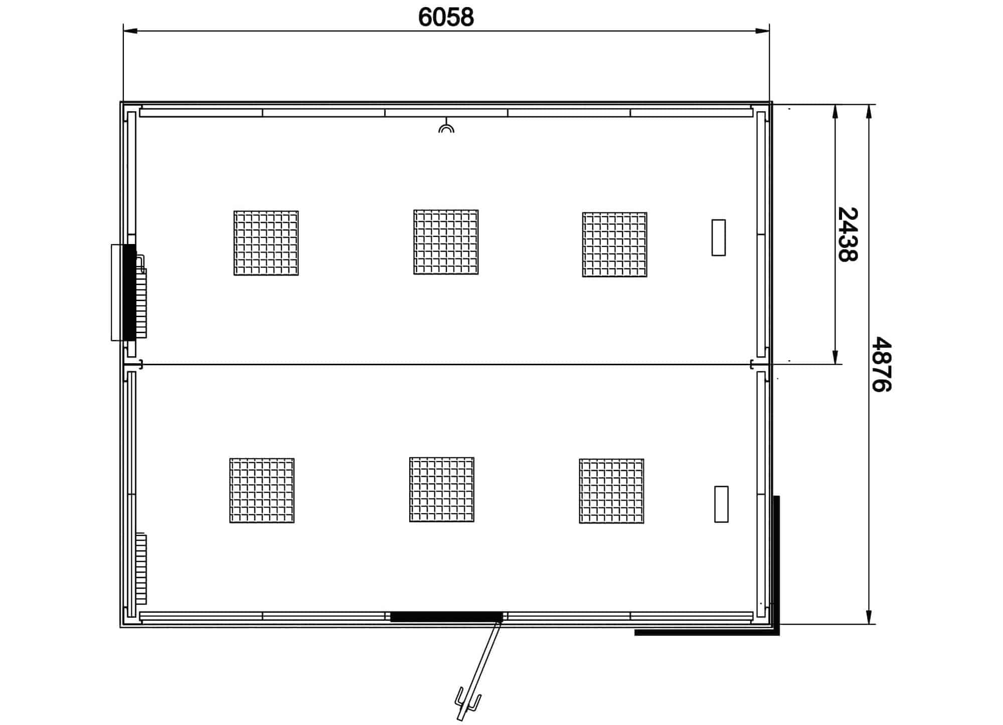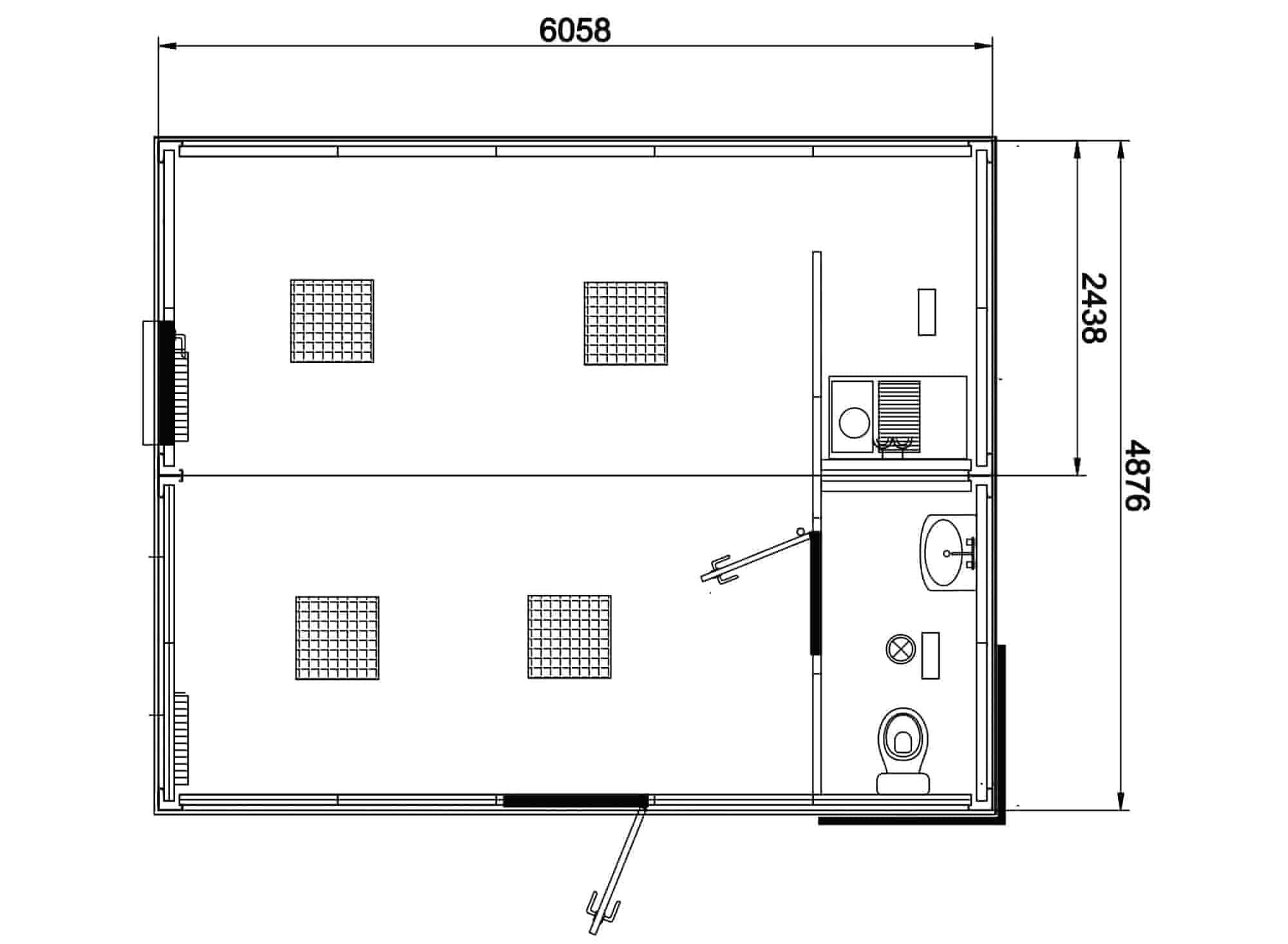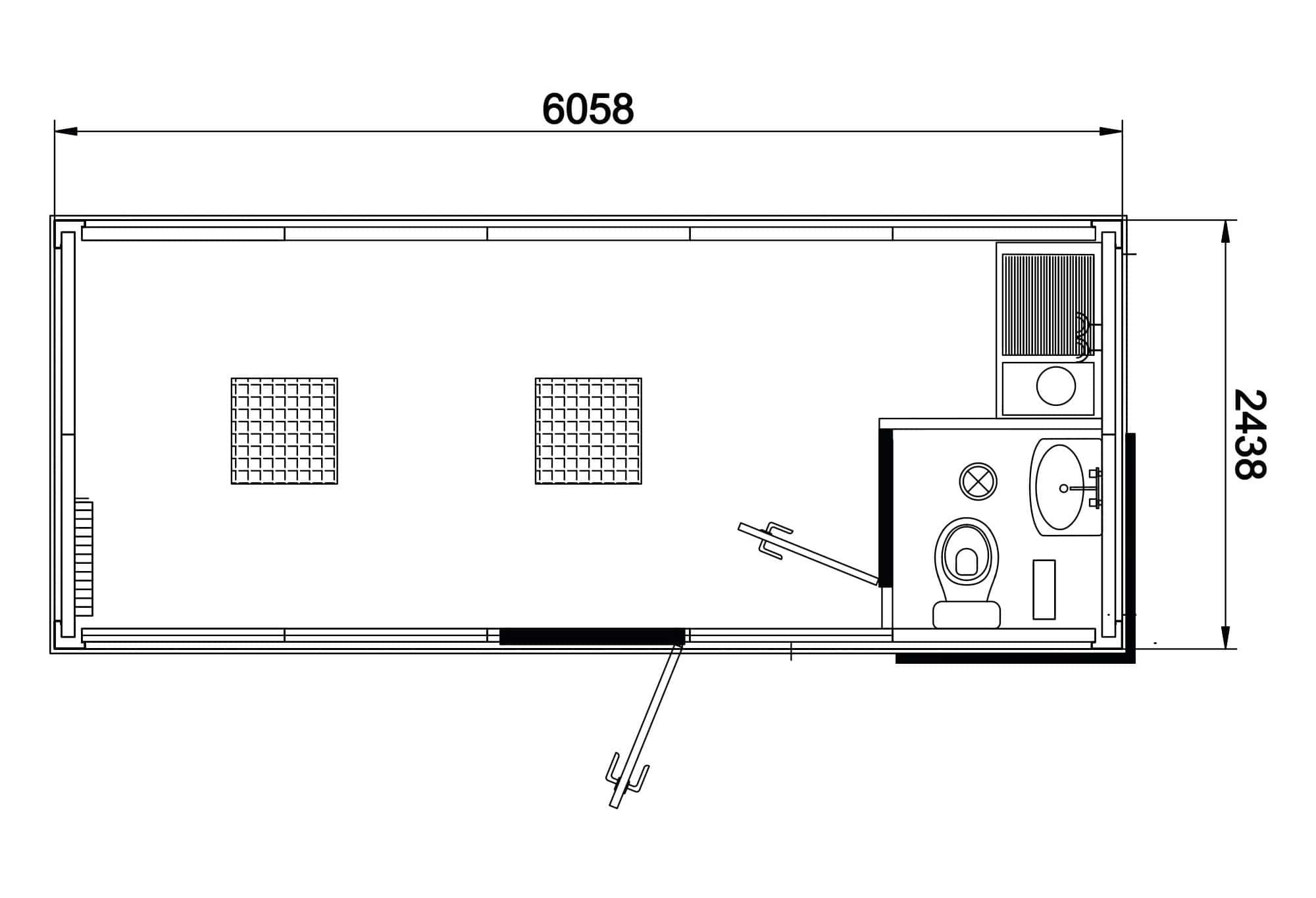 PAWILON BIUROWY z jednego kontenera: szer. 2438 mm x dł. 6058 mm x wys. 2800 mm; wys. wew. 2500 mm.