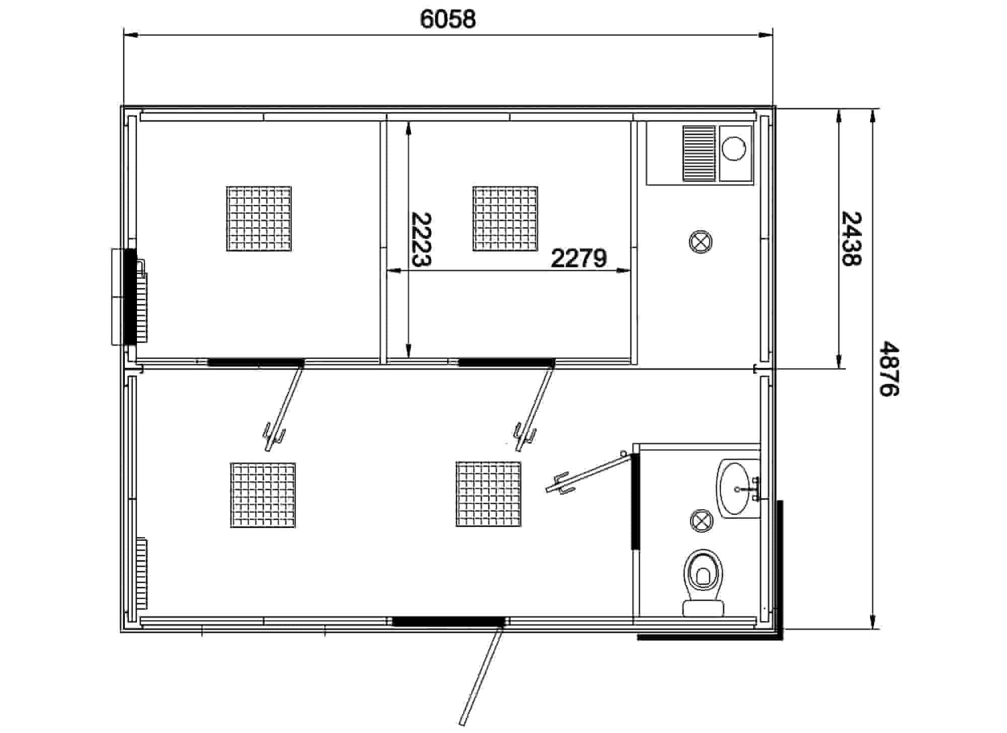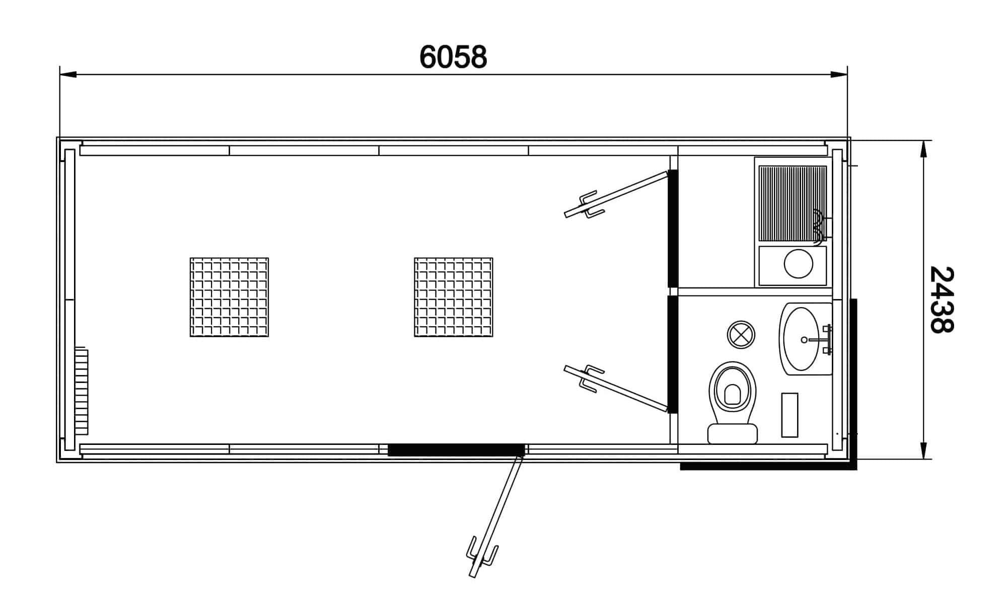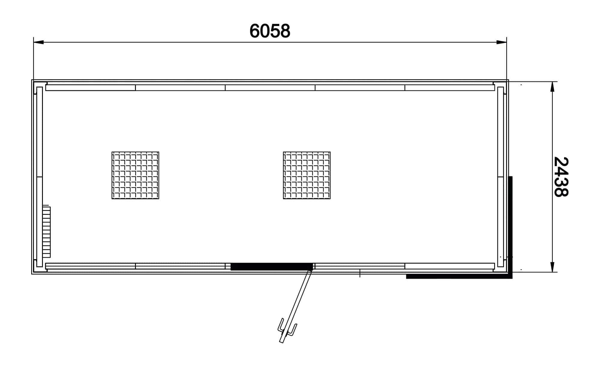 PAWILON BIUROWY z jednego kontenera: szer. 2438 mm x dł. 6058 mm x wys. 2800 mm; wys. wew. 2500 mm.