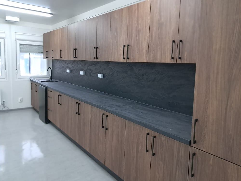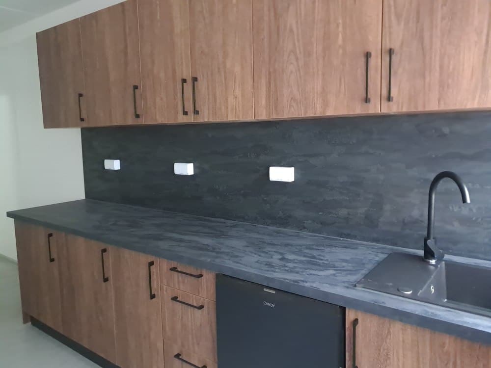 - Przestronna jadalnia / aneks kuchenny: wydzieliliśmy również dużą strefę socjalną, która została przez nas kompleksowo wyposażona w elegancką zabudowę meblową pod wymiar w kolorze drewna, ciemne blaty robocze oraz zlew z kranem.