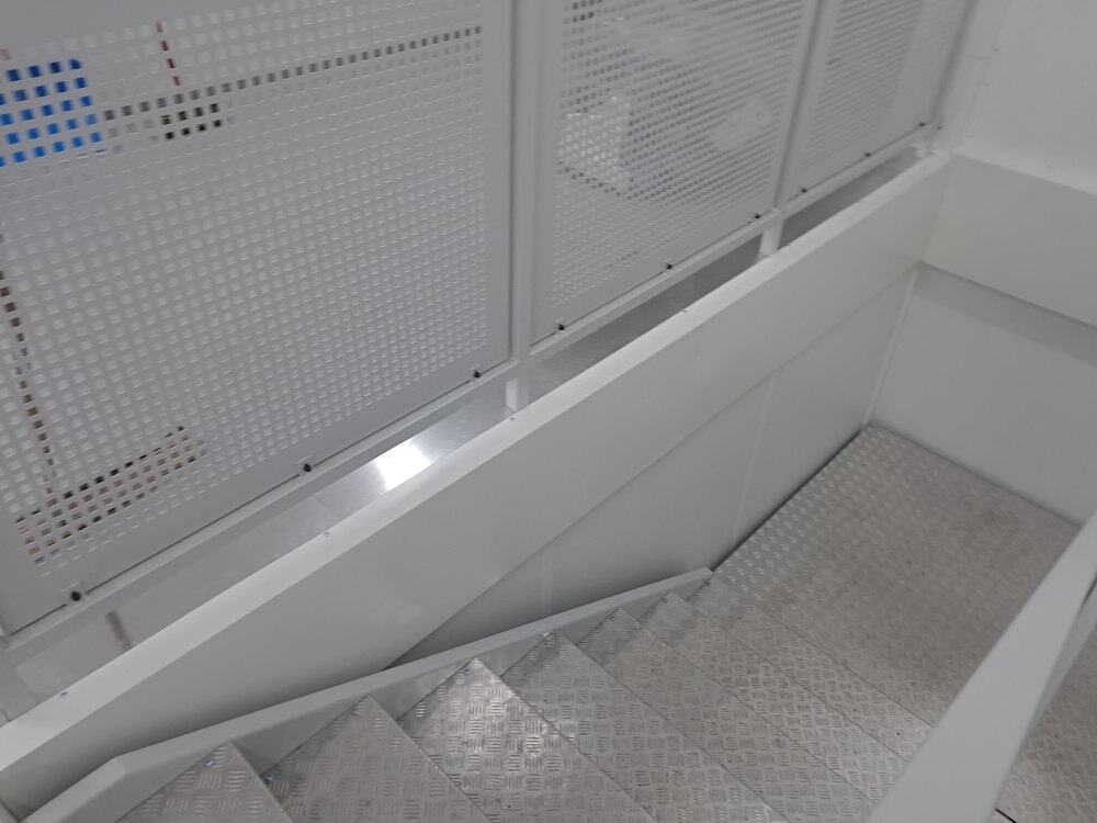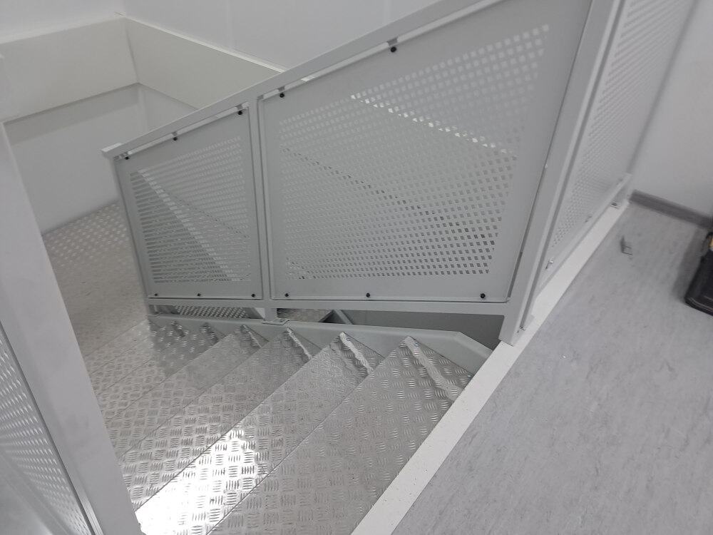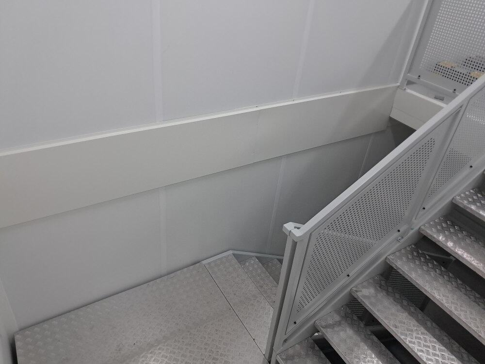 - Nowoczesna klatka schodowa: ponieważ budynek posiada dwie kondygnacje (nasze standardowe kontenery mają możliwość piętrowania do trzech kondygnacji), zamontowaliśmy wewnętrzną, solidną stalową klatkę schodową z bezpiecznymi stopniami z blachy ryflowanej, estetycznymi balustradami z blachy perforowanej oraz gładkimi panelami wykończeniowymi na ścianach klatki.