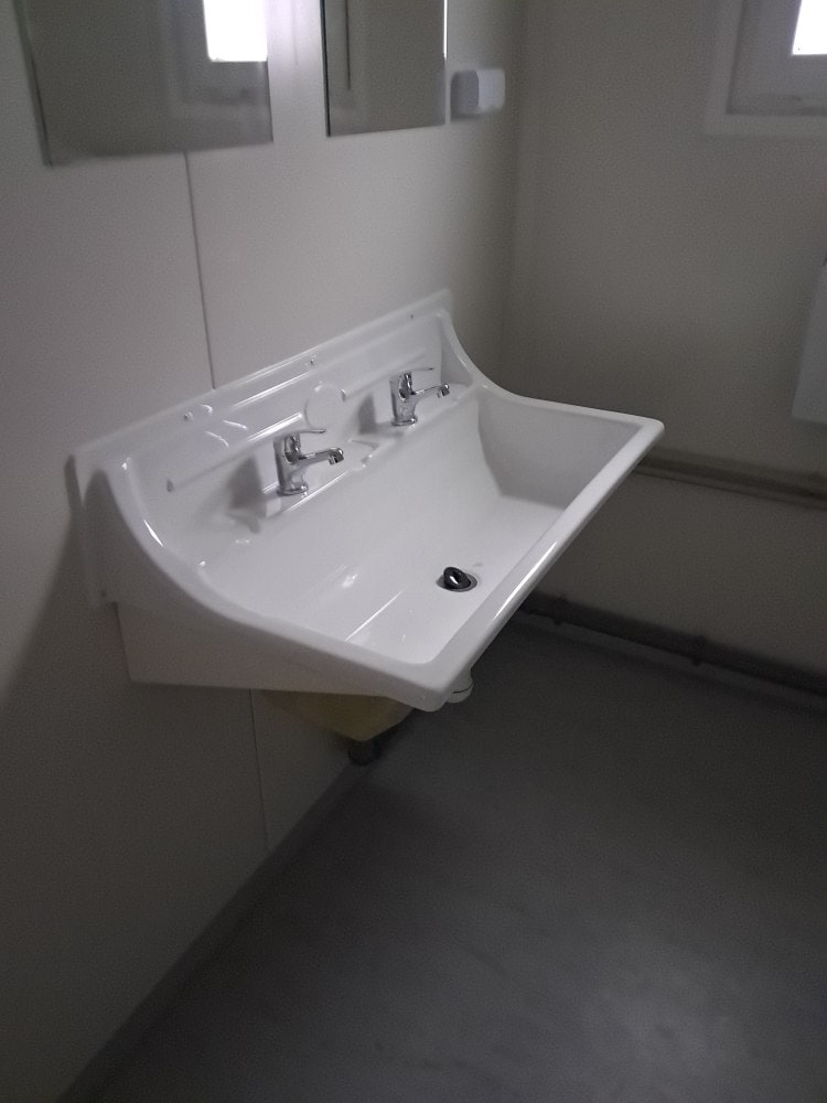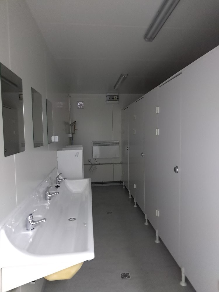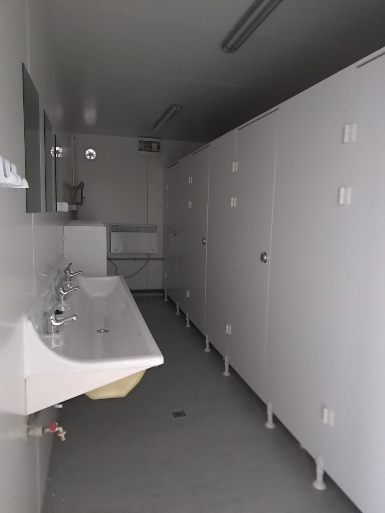 - Rozbudowane kontenery sanitarne: Aby sprostać potrzebom dużej liczby pracowników, w obiekcie znalazły się w pełni wyposażone, estetyczne toalety z wielostanowiskowymi umywalkami, pisuarami, kabinami WC i lustrami.