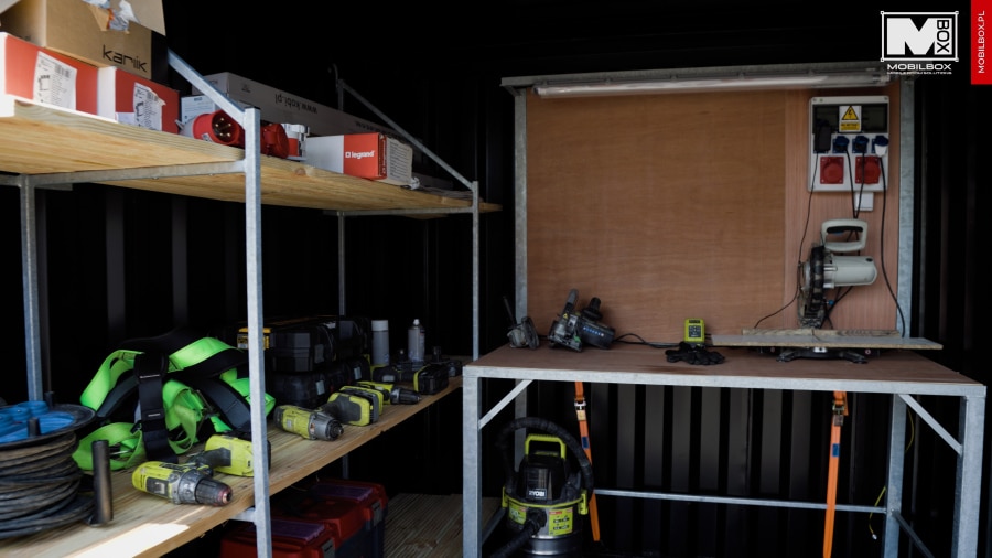 This specially selected container has been equipped to provide you with everything you need to effectively conduct simple workshop work. Equipped with electrical and lighting installations, it provides not only a safe and functional place to store tools , but also the ability to conduct various works at any time.