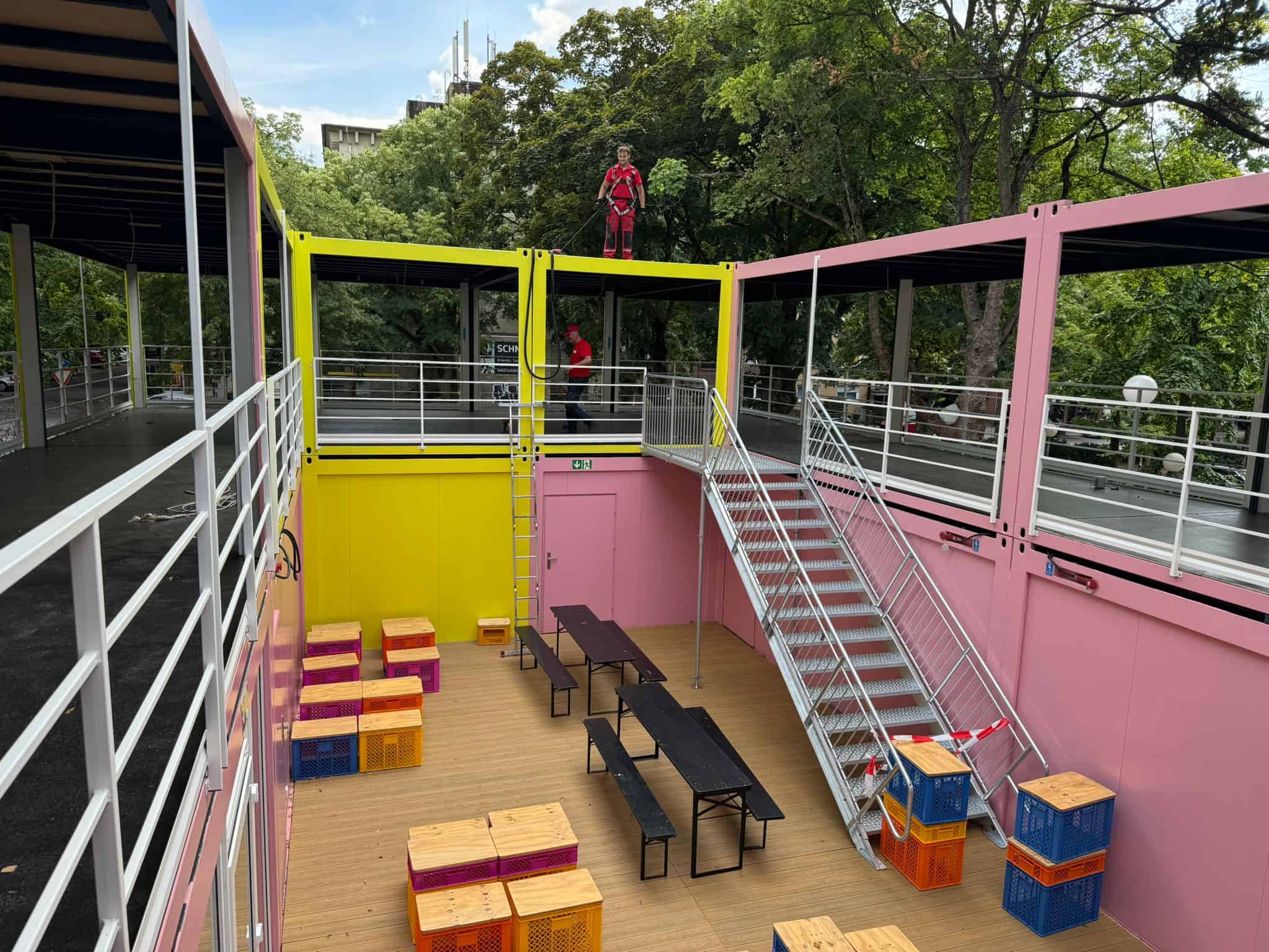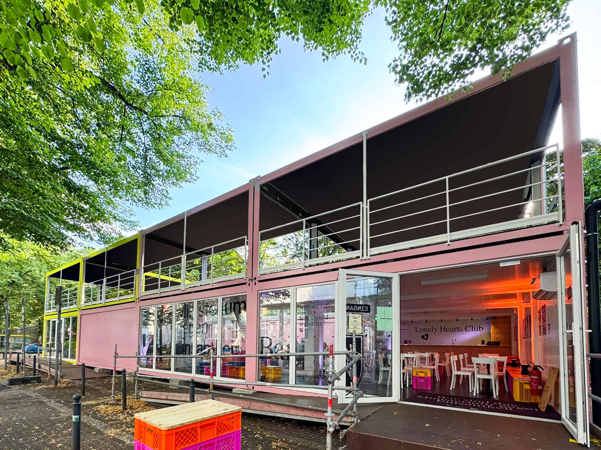 Kawiarnia z Kontenerów Mobilbox: Dwupoziomowy Bar z Tarasem – Realizacja „Pod Klucz” w Soczystych Kolorach!
