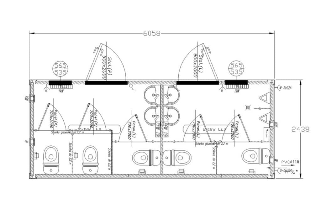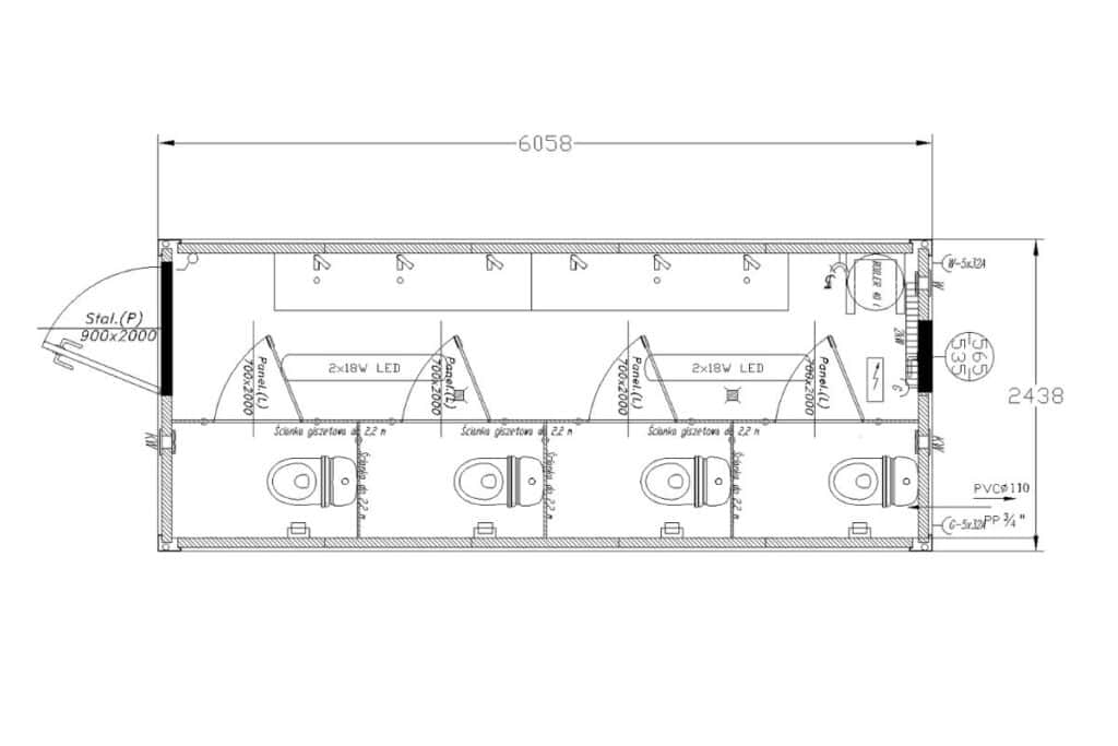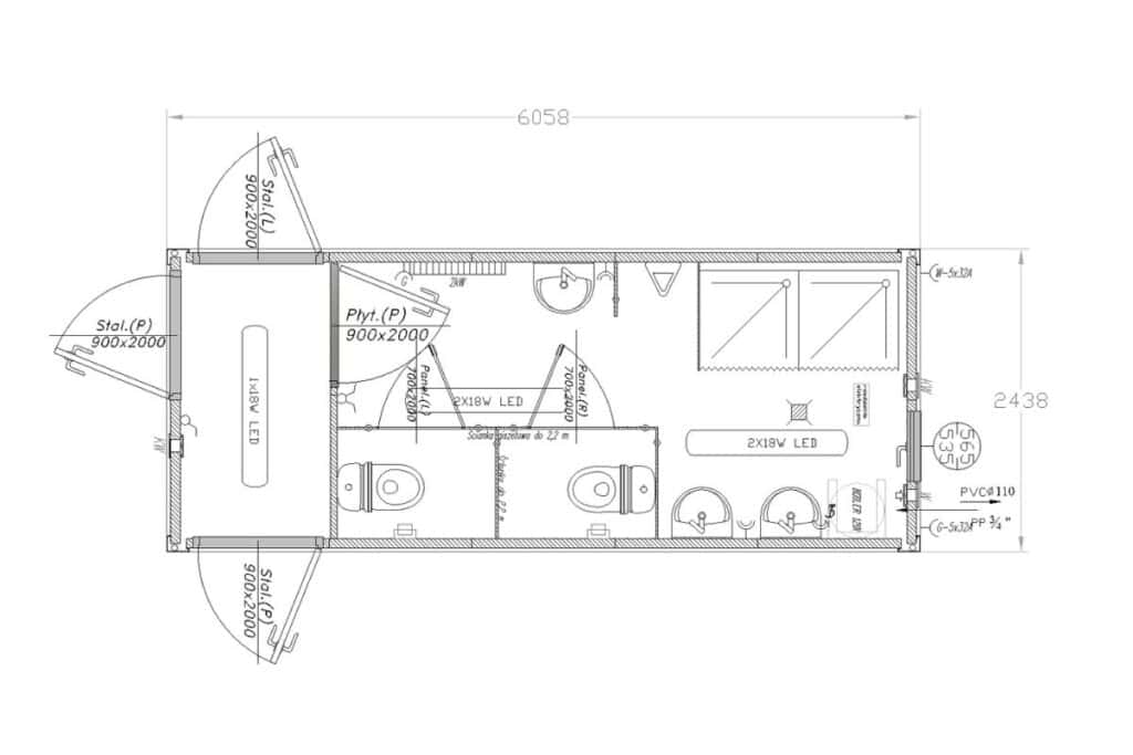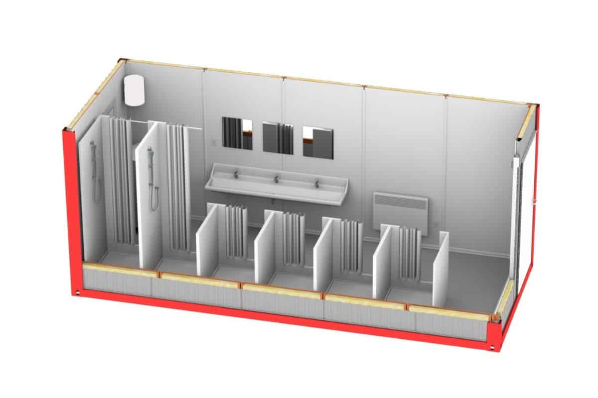• Kontenery zawierające osobno prysznic oraz osobno WC.