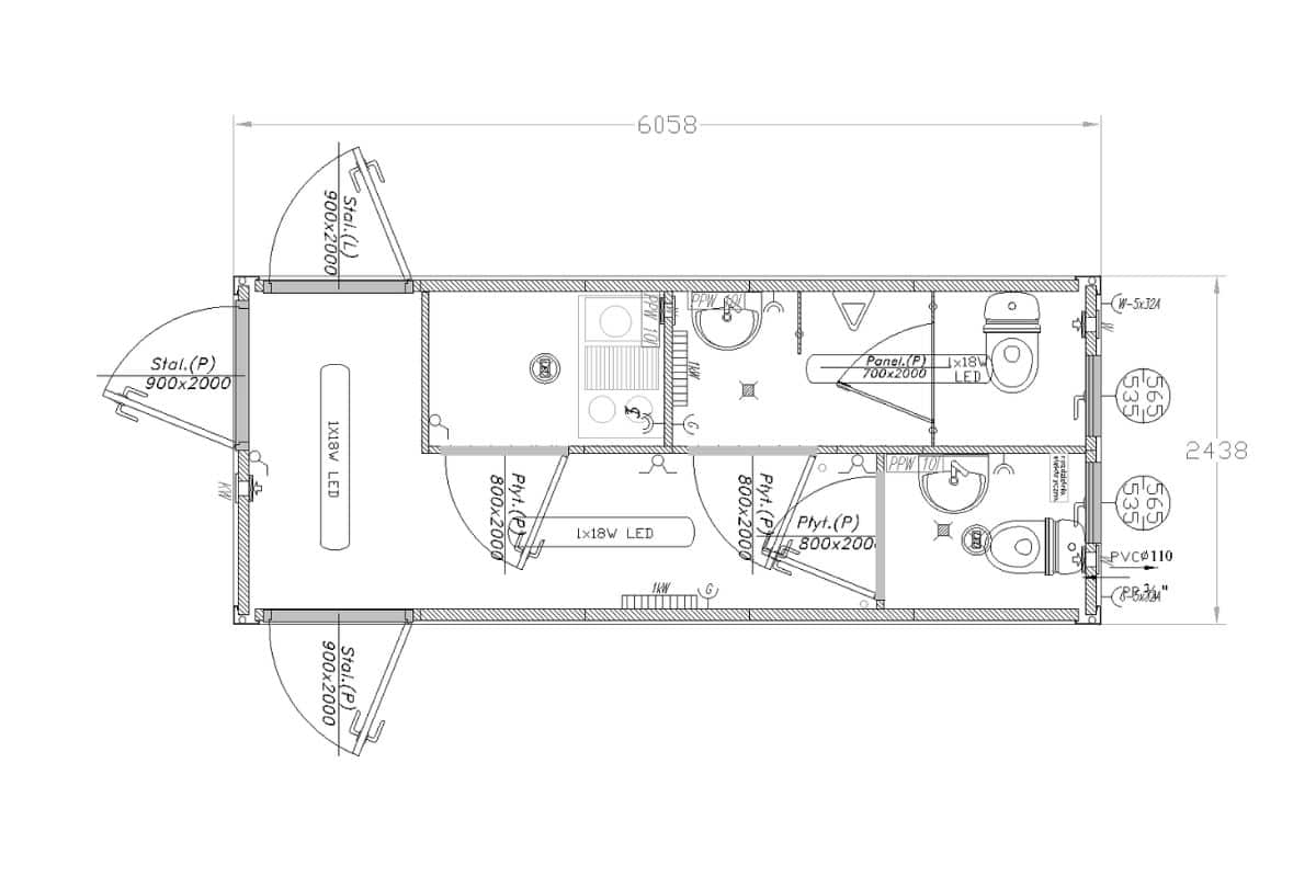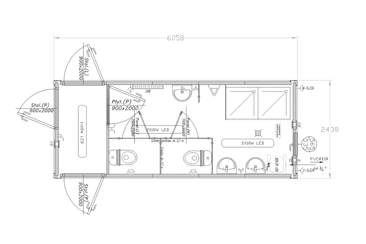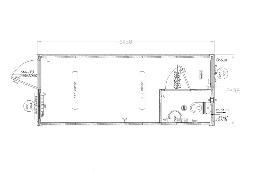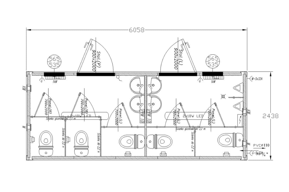 • Kontenery zawierające osobno prysznic oraz osobno WC.