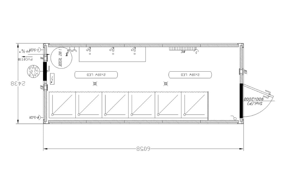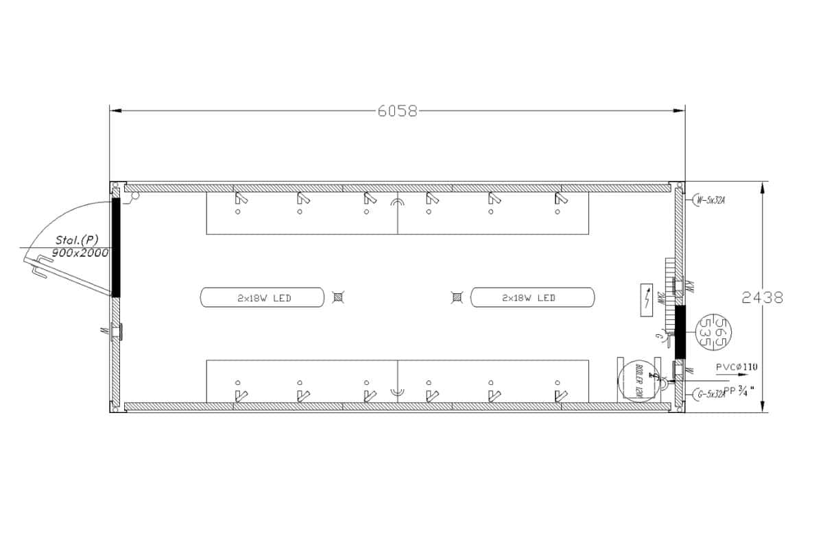 WYMIARY KONTENERA SANITARNEGO: Lz = 6 058 mm, Sz = 2 438 mm, Hz = 2 800 mm, Hw = 2 500 mm