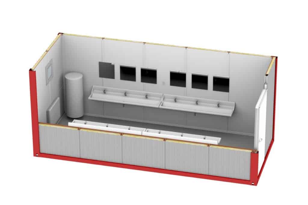 ŁAZIENKA KONTENERA : muszla toaletowa, umywalka lub rynna umywalkowa wielostanowiskowa, bojler elektryczny 40 I, lustro z półką, uchwyt na papier toaletowy, dozownik mydła.